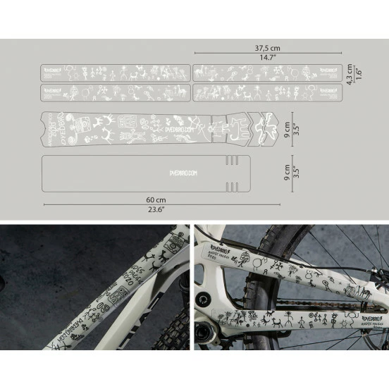 Adhésifs de protection vinyl transparent de 300 micron d’épaisseur, imprimés avec encres latex, prédécoupés pour s’adapter aux différents cadres vélos. Il peut être nécessaire de recouper certaines pièces avec une paire de ciseaux ou un cutter pour une parfaite adaptation au support.