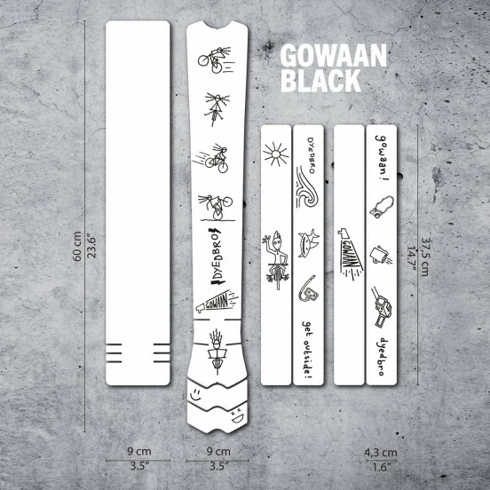 Disponible en noir ou blanc, il s’agit d’un design célébrant le projet Gowaan Girls de Bex et Martha. Les croquis sont de Martha, le logo DYEDBRO est écrit à la main pour un style fun et minimaliste Adhésifs de protection vinyl transparent de 300 micron d’épaisseur, imprimés avec encres latex, prédécoupés pour s’adapter aux différents cadres vélos. Il peut être nécessaire de recouper certaines pièces avec une paire de ciseaux ou un cutter pour une parfaite adaptation au support.